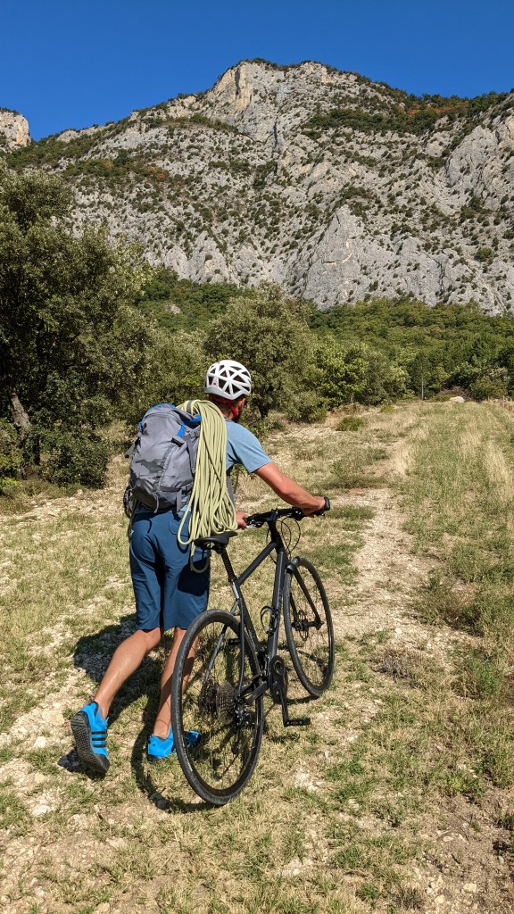 L’objectif du jour est de faire notre premier trip vélo/grimpe autour de la maison, et on jette notre dévolu sur le pilier du soleil, une très jolie mini grande voie dans la paroie de la Ceyte après Saou !