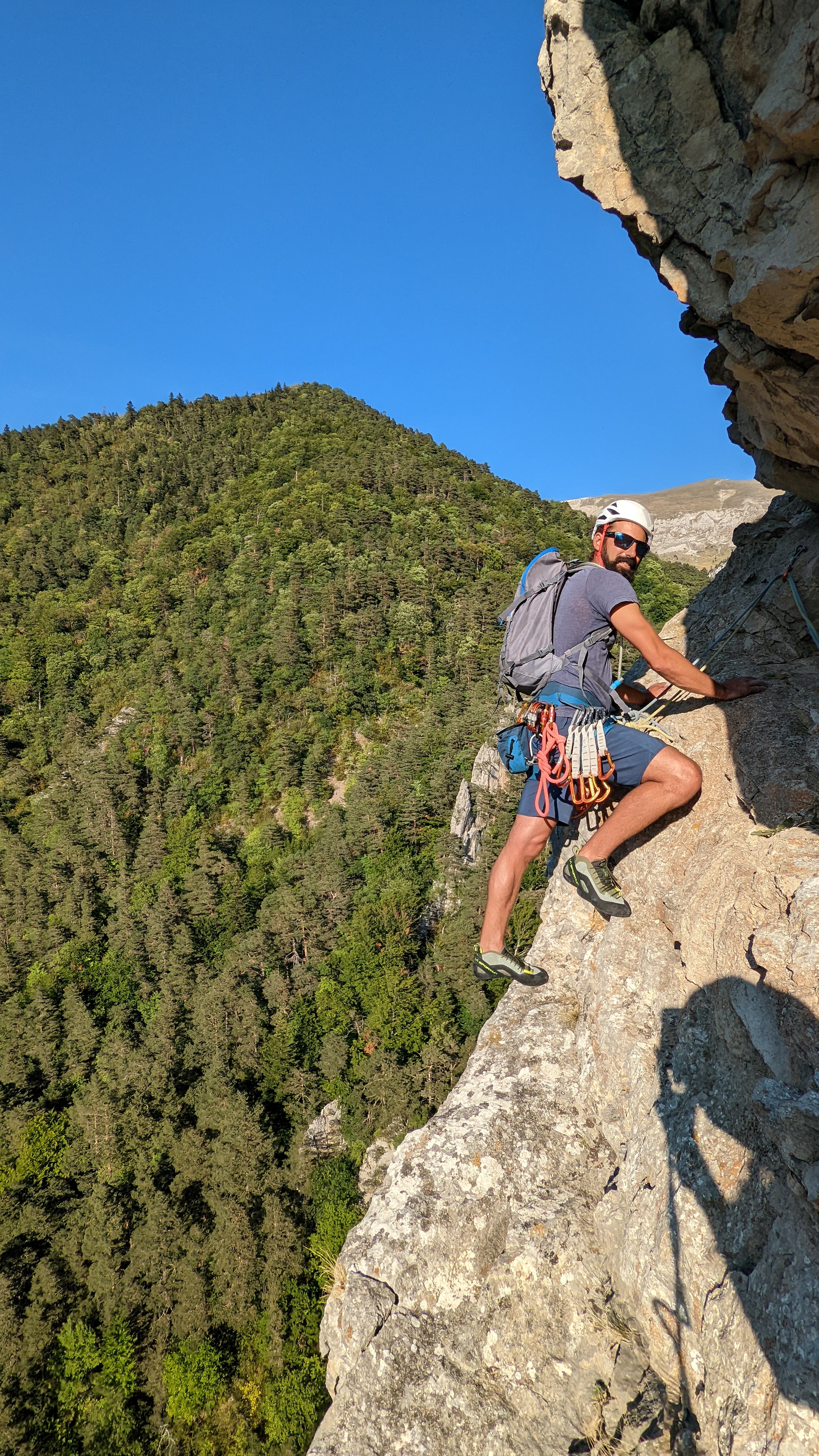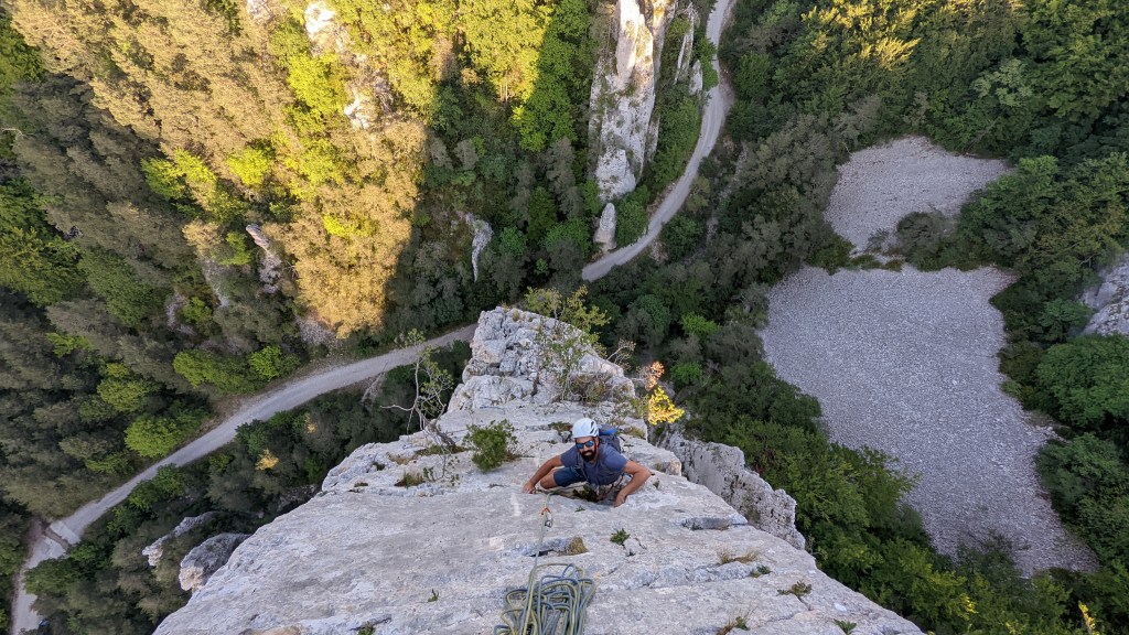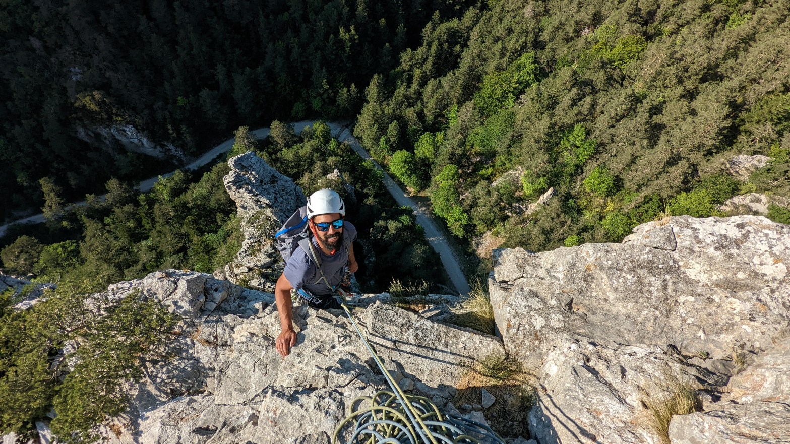 Une petite traversée plein gaz pour rejoindre la dernière et jolie longueur qui mène au sommet de la sucette et nous voila en haut ! La vue est superbe et les relais bétons, nous sommes ravis ! L’apéro étant une chose très importante, voir primordiale dans notre vie, nous nous empressons de redescendre en pensant à ces bonnes Chouffes qui nous attendent dans la glacière !