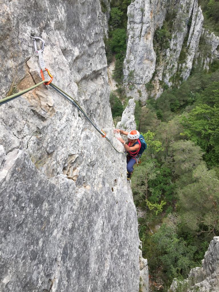 Nous ne nous laissons pas impressionner par cette approche bartasse absolument pas prévue au programme et arrivons miraculeusement au pied de la voie ! Celle ci ne doit pas être répétée très souvent car notre accès était visiblement le bon et pas tracé ! En bas de L1, on est pas très confort et je me longe à un buis pour pouvoir assurer Adri ! Je le regarde attentivement évoluer jusqu’au premier point en mode escalade sur tas de Kappla, et ensuite, ouf, le rocher devient meilleur ! C’est un 5c fissure assez malcommode un peu à l’ancienne. Je me réjouie d’avance de ces futures coincements en tout genre et devine que ça va être bijoux pour moi…